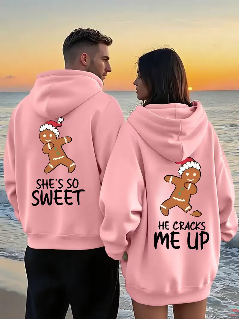 Yılbaşı konseptine özel tasarlanan gingerbread baskılı oversize hoodie, eğlenceli mesajlarıyla sevgili çift kombinleri arasında öne çıkar.