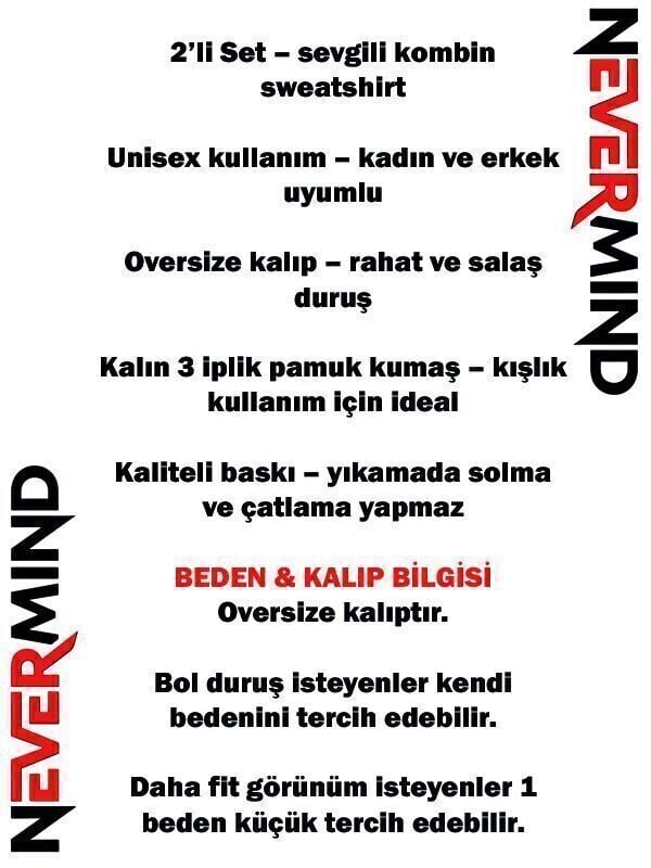 • Sevgili Çift Kombin Hoodie Set – Trend Baskılı Oversize Unisex 3 İplik Kapüşonlu Sweatshirt 2’li, modern sokak stilini ve rahatlığı bir araya getirerek çift kombinlerinde zamansız bir görünüm sunar. Unisex oversize kalıbı sayesinde hem kadın hem erkek kullanıcılar için rahat ve trend bir kullanım sağlar.