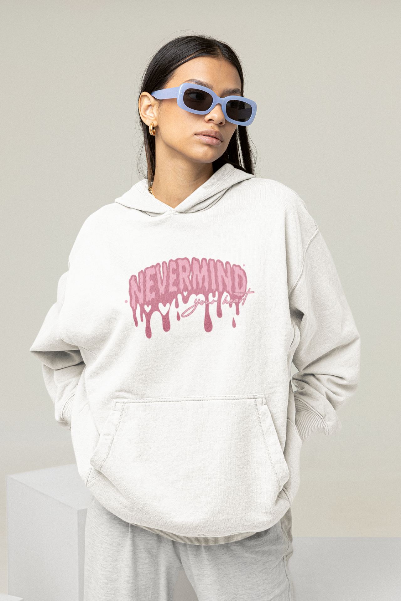 The oversize white hoodie sweatshirt, which will reflect your style, is one of the indispensable pieces of street fashion with its modern cut and eye-catching pink NEVERMIND print.