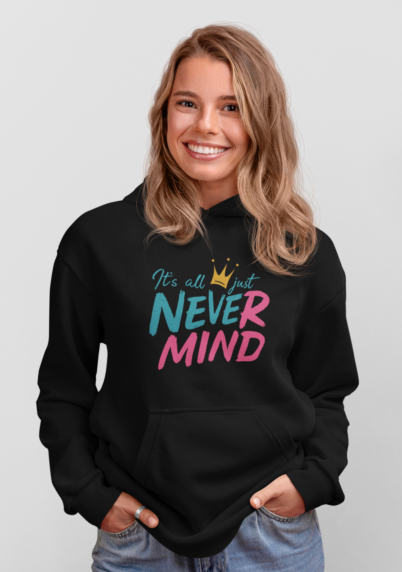 Tarzına enerji katacak modern bir parça arıyorsan, bu unisex oversize siyah hoodie tam sana göre! Ön kısmında yer alan renkli NEVERMIND baskısı ve taç detayıyla dikkat çeken tasarım, sokak modasının (streetwear) dinamik ruhunu yansıtıyor.